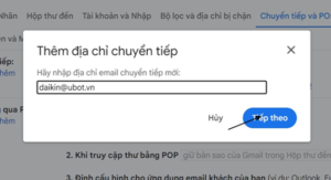 Nhập địa chỉ mail nhận hóa đơn UBot vào mục Thêm địa chỉ chuyển tiếp >> Tiếp theo