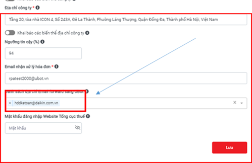 Bước 4.2: Trong mục Danh sách các địa chỉ Email forward sang UBot, nhập địa chỉ email muốn cài đặt, kết thúc bằng Enter. Chọn Lưu