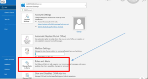 Bước 4.3: Tại giao diện Outlook của bạn, Chọn File –> Chọn Manage Rules & Alerts