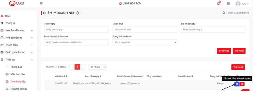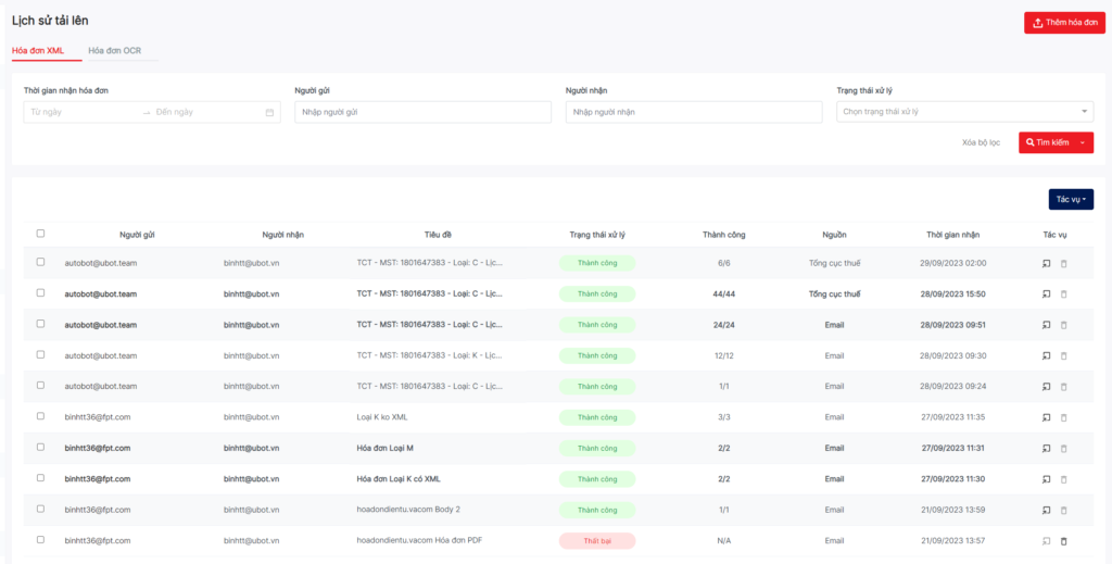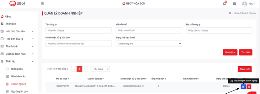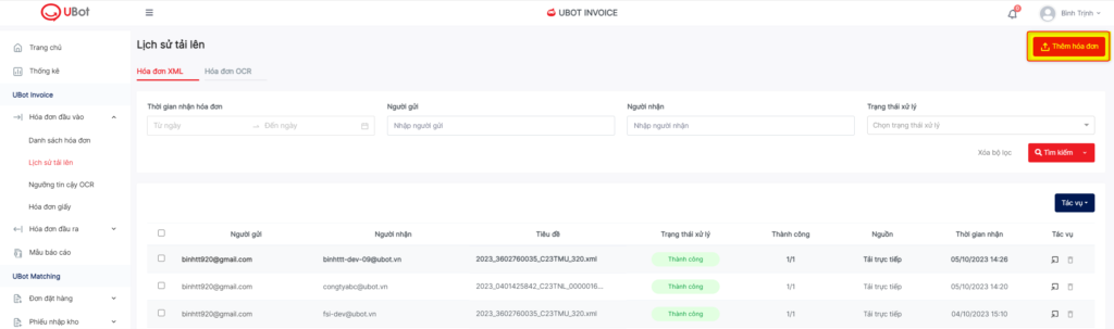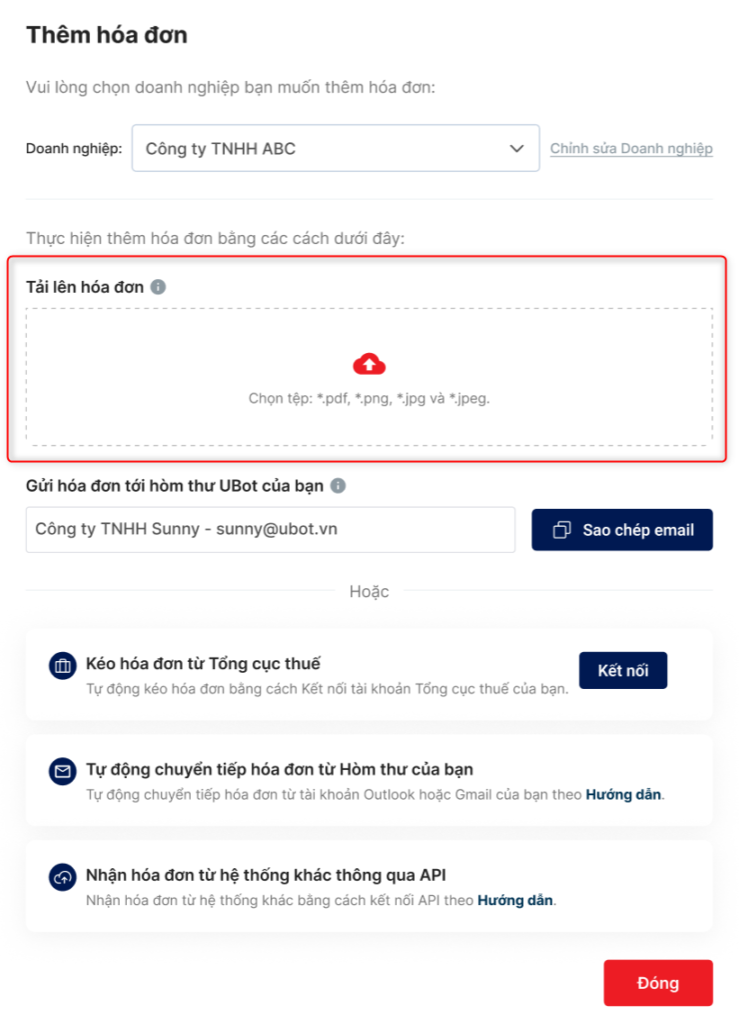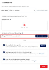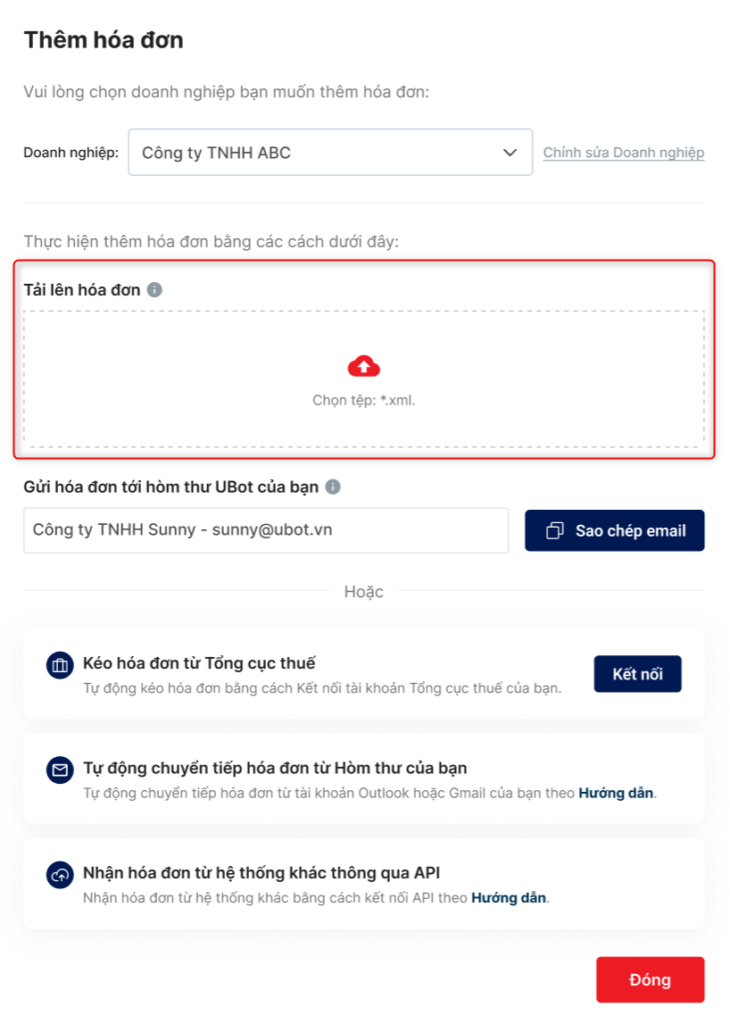 - Mỗi doanh nghiệp có 1 hòm thư UBot nhận hóa đơn tương ứng.