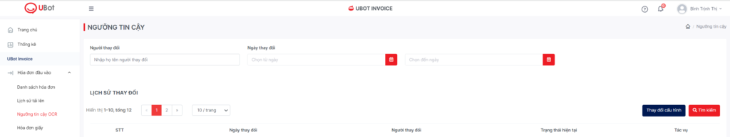 Bước 1. Sau khi Đăng nhập vào UBot, truy cập menu Hóa đơn đầu vào >> chọn tab Ngưỡng tin cậy OCR, hệ thống hiển thị màn hình sau: