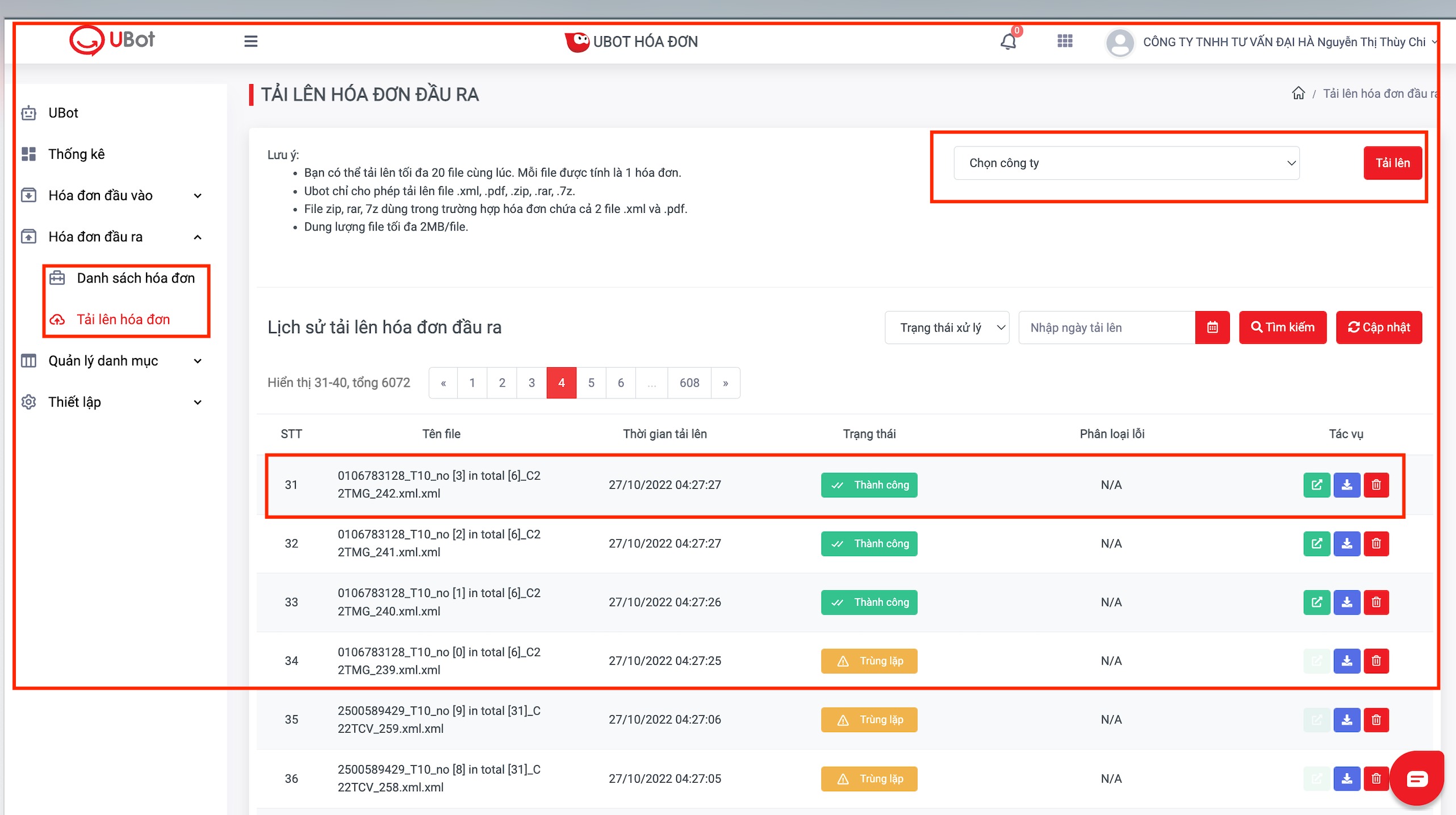 Bấm chọn file Công ty để tải lên >>> Chọn file hoá đơn PDF hoặc XML (đúng định dạng hoá đơn như Lưu ý bên trái màn hình) >>> Tải lên hoá đơn sẽ báo Thành Công >>> Tác vụ >> tác vụ Nút xanh lá >> Xem chi tiết hoá đơn.