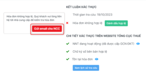 Cách 1: Khách hàng phải kiểm tra lại thông tin hóa đơn và yêu cầu người bán kiểm tra lại hóa đơn bằng tính năng “Gửi Mail cho NCC” bằng cách di chuyển chuột tới Hóa đơn không hợp lệ trong Kết luận xác thực