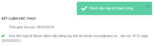 Sau khi xử lý xong hóa đơn được gửi đến, UBot trả trạng thái tra cứu hóa đơn là hợp lệ hoặc không hợp lệ.