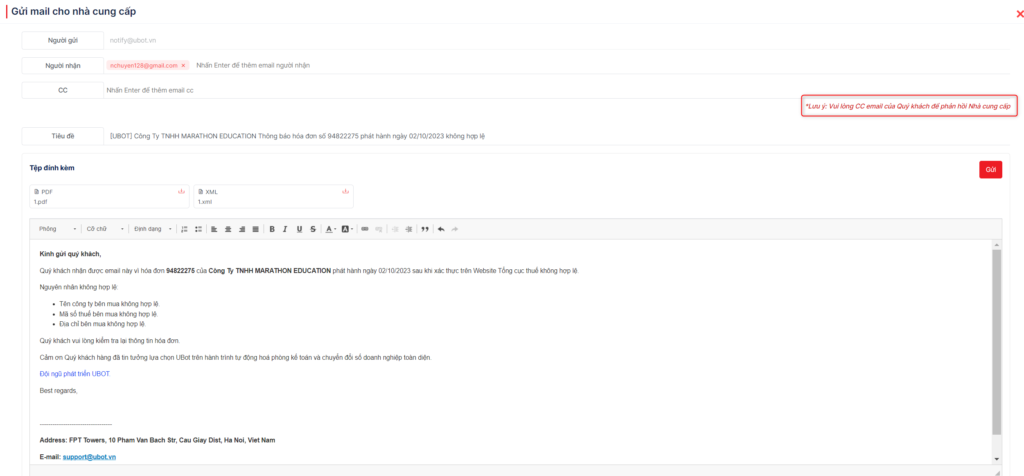 Chọn nút Gửi email cho nhà cung cấp >> hệ thống hiển thị thông tin đầy đủ để bạn gửi sang địa chỉ mail nhà cung cấp